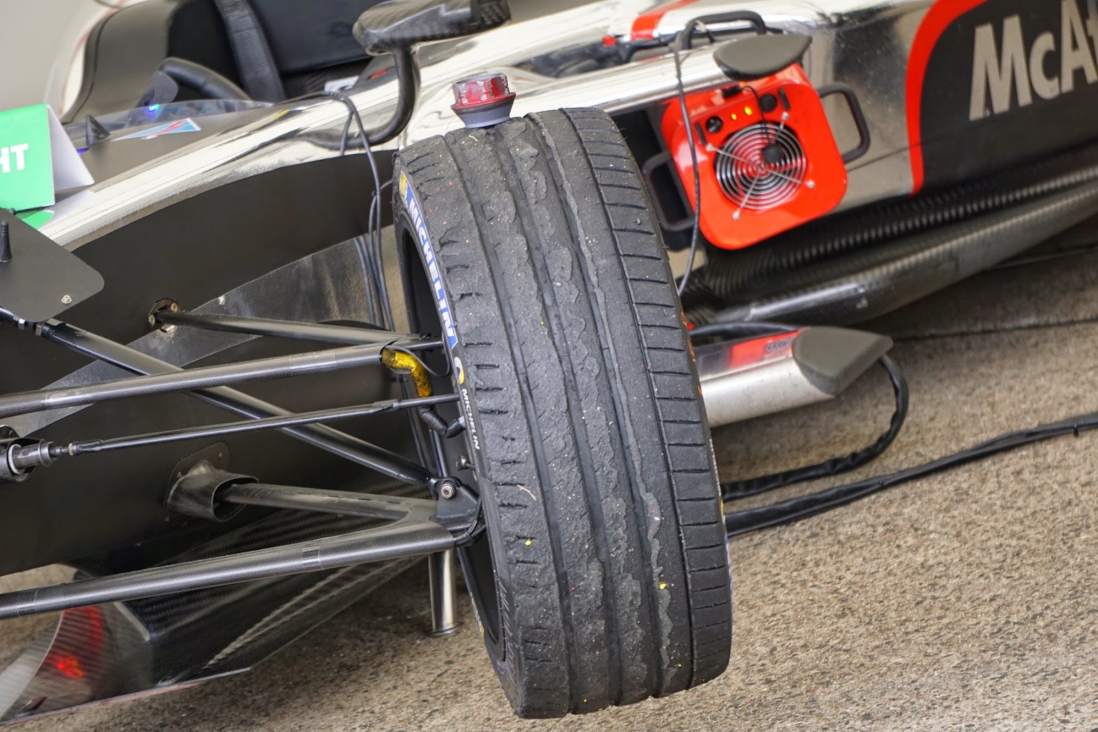 racingdekk. Merk dekk i entall. I Formula E, er det nemlig bare ett dekk, og