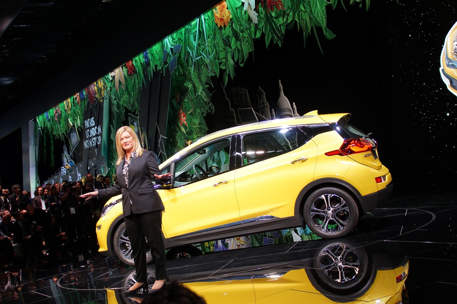 I starten av presentasjonen, før selve bilen rullet ut på scenen, viste Opel en animert film (se det hele på Facebooksiden vår). Den handlet om at Ampera-e kjørte fra alle konkurrentene på vei til Paris. De måtte stoppe for å lade underveis.
