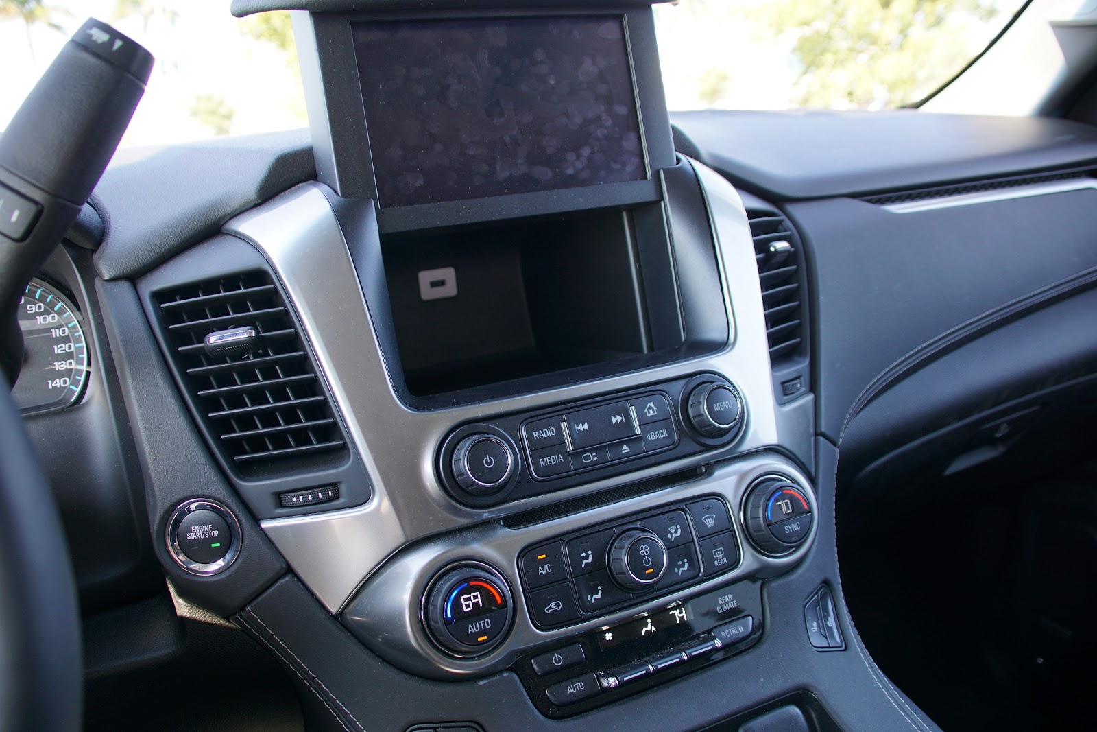Under skjermen befinner to paneler for klimaanlegg seg. Den