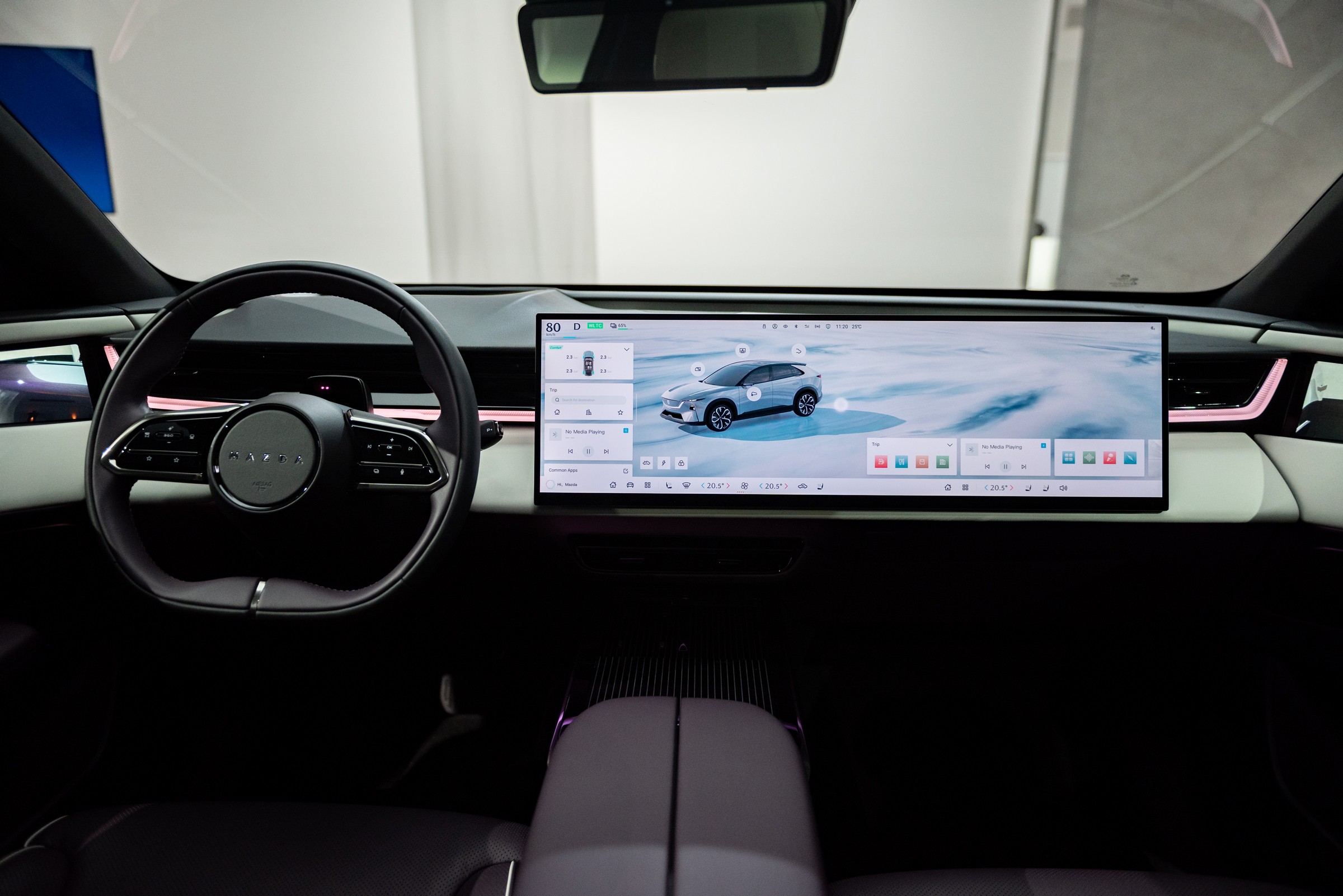 Skjermen i prototypen vi fikk se på i Mazdas utviklingssenter like utenfor Frankfurt i desember hadde bare en demovisning av innholdet på den digre skjermen, men det er i hvert fall ingen tvil om at grensesnittet minner veldig om det vi finner i en rekke kinesiske elbiler, med en stripe for klimaanlegget nederst og forskjellige «fliser» for medie-, bil- og navigasjonsstatus.